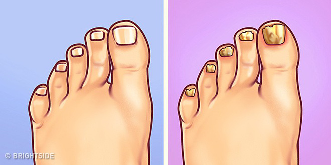 Móng chân vàng, bì dày và dễ gãy hơn so với bình thường là dấu hiệu nhiễm nấm. Vệ sinh kém là một trong những nguyên nhân hàng đầu gây ra hiện tượng này. Ngoài ra, nó còn bắt nguồn từ thói quen đi giày bít quá lâu, mang tất ướt...