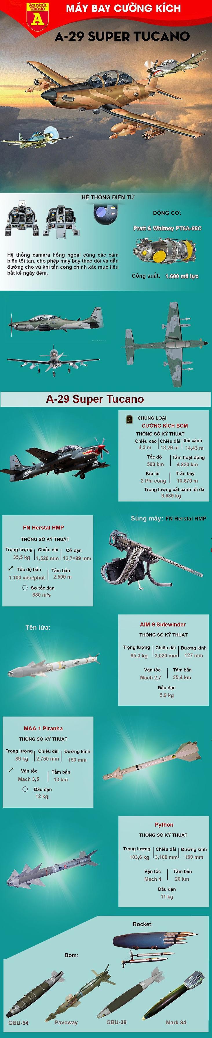 A-29 Super Tucano là loại máy bay động cơ cánh quạt được thiết kế cho tấn công hạng nhẹ, chống chiến tranh du kích và huấn luyện phi công. Mẫu máy bay này được trang bị hệ thống vũ khí và điện tử hàng không hiện đại hợp nhất.