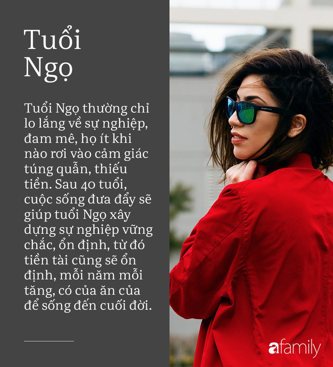 Tuổi Ngọ cũng từng trải qua giai đoạn khó khăn, tưởng chừng như gục ngã nhưng bên cạnh họ vẫn luôn có quý nhân phù trợ, giúp đỡ nên mọi chuyện cũng êm đẹp trôi qua. Tuổi Ngọ thường chỉ lo lắng về sự nghiệp, đam mê, họ ít khi nào rơi vào cảm giác túng quẫn, thiếu tiền. Sau 40 tuổi, cuộc sống đưa đẩy sẽ giúp tuổi Ngọ xây dựng sự nghiệp vững chắc, ổn định, từ đó tiền tài cũng sẽ ổn định, mỗi năm mỗi tăng, có của ăn của để sống đến cuối đời.