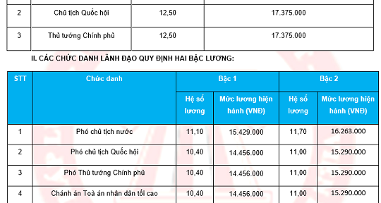 Từ ngày 01/7/2018, mức lương cơ sở tăng từ 1.300.000 lên 1.390.000. Bởi vây mức lương của tất cả công chức nhà nước cũng tăng khoảng 6.96% một tháng. Theo đó Chủ tịch nước được tăng lên 18.070.000 đồng/tháng (quy định cũ là 16.900.000 đồng/tháng); Chủ tịch Quốc hội, Thủ tướng Chính phủ được tăng lên 17.375.000 đồng/tháng.