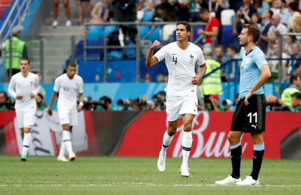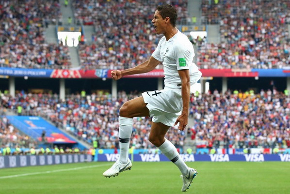 Varane số 4 ăn mừng sau khi đánh đầu vào lưới.