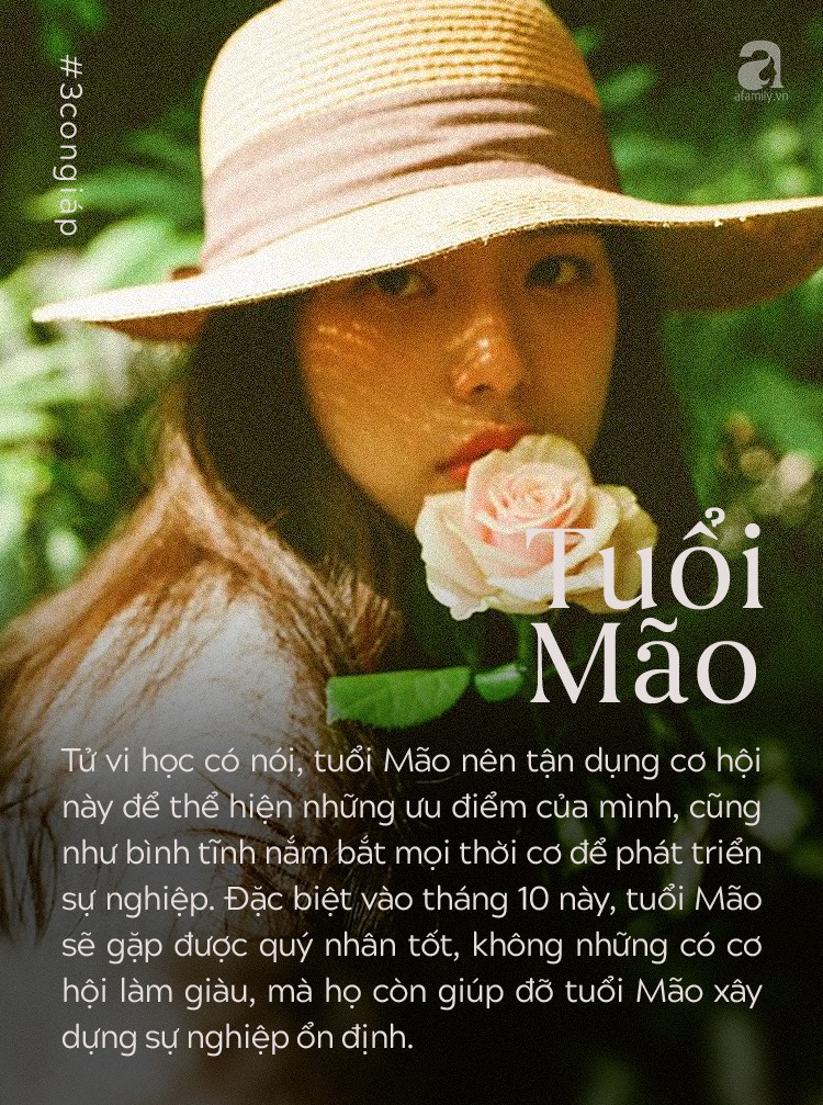 Đặc biệt vào tháng 10 này, tuổi Mão sẽ gặp được quý nhân tốt, không những có cơ hội làm giàu, mà họ còn giúp đỡ tuổi Mão xây dựng sự nghiệp ổn định. Điều cần làm nhất của tuổi Mão chính là phải luôn chăm chỉ dù trong bất cứ hoàn cảnh nào. Cuối năm nay, hãy đừng lo lắng, tuổi Mão sẽ là con giáp phát tài nhất.