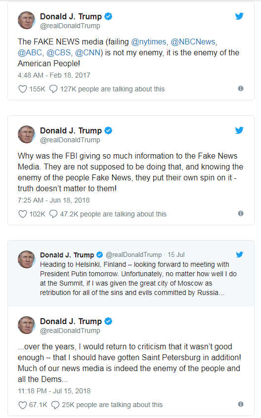 Tháng 2/2018 ông từng chỉ trích truyền thông nhiều lần trước đây – trong một số trường hợp chỉ đích danh các cơ quan báo chí mà ông cho là “truyền thông đưa tin giả”, gọi đây là “kẻ thù của người dân Mỹ”.