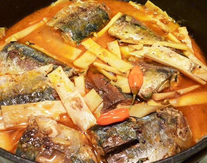 - Chiên sơ cá cho săn thịt và để riêng ra ngoài. Tiếp tục cho măng vào xào sơ qua và xếp cá lại, chêm thêm nước, nêm gia vị lại khi nước sôi. Kho cá đến khi nước gần cạn, tắt bếp và cho thêm ớt tươi cắt nhỏ vào.