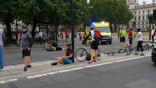 Chiếc xe hơi đă chuyển đâm thẳng vào người đi xe đạp và người bộ hành ngay sau lúc 07:30 giờ London hôm 14/8/2018, làm ba người bị thương.