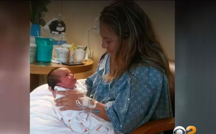 Bà Maria del Carmen Venegas và đứa con mới sinh trong bệnh viện. (Hình: KCBS-TV)
