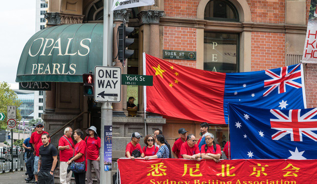 Người Trung Quốc tại Australia treo cờ và băng rôn chào đón chuyến thăm của Thủ tướng Trung Quốc tới Australia (Ảnh: Shutterstock)