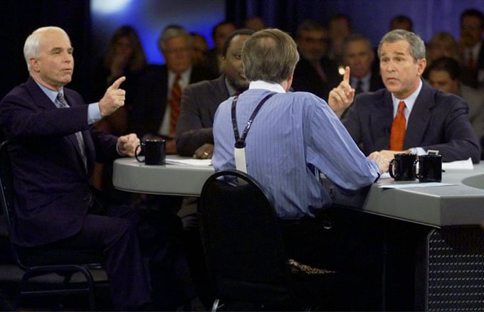 Ứng cứ viên tổng thống đảng Cộng hoà John McCain và ông George W Bush trả lời câu hỏi của MC Larry King trong một cuộc tranh luận ứng cử tổng thống ở Nam Carollina tháng 2/200. Ảnh: AP.