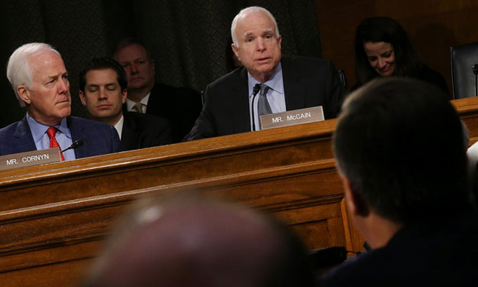 John McCain chất vấn Mike Pompeo khi làm chứng trước một buổi điều trần thượng viện tại Washington tháng giêng năm 2017. Ảnh: Reuters