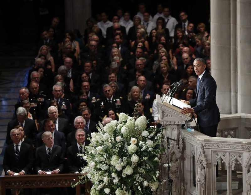 Còn trong bài điếu văn của mình, cựu tổng thống Mỹ Barack Obama cũng mạnh mẽ lên án những hành động sỉ nhục người khác và gây “tranh cãi giả tạo” hiện tồn tại giữa đời sống chính trị và hình ảnh trước công chúng. “Đó là kiểu chính trị giả vờ tỏ vẻ dũng cảm và gan lỳ, nhưng thực chất dược sinh ra từ nỗi sợ hãi. John muốn chúng ta vĩ đại hơn như vậy. Ông ấy kêu gọi chúng ta phải sống tốt hơn như vậy”, cựu tổng thống Mỹ nhấn mạnh. Ảnh: AP.
