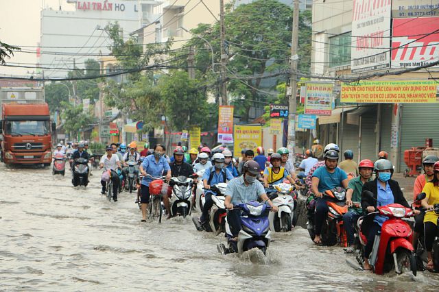 Sáng nay 9/10, triều cường tại Sài Gòn đạt đỉnh. Tất cả các tuyến đường đều ngập nặng. Nhiều phương tiện chết máy, người dân phải bì bõm dắt bộ, công an cũng lao vào giải tỏa cho xe máy.