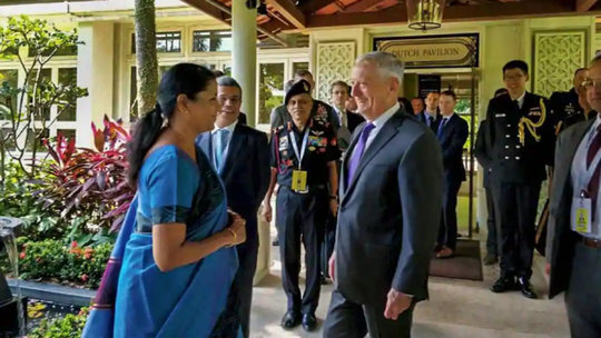 Bà Sitharaman và ông Mattis gặp nhau bên lề Hội nghị Bộ trưởng Quốc phòng ASEAN hôm 19-10. Ảnh: PTI