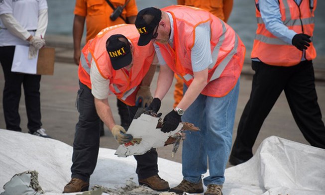 Các quan chức Indonesia kiểm tra mảnh vỡ từ chiếc Boeing 737 MAX 8 rơi xuống biển. Ảnh: AFP.