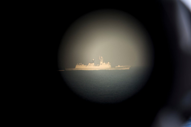 Một tàu hộ vệ của Trung Quốc được quan sát qua ống nḥm trên tàu Chancellorsville của Mỹ năm 2016. (Ảnh: New York Times)