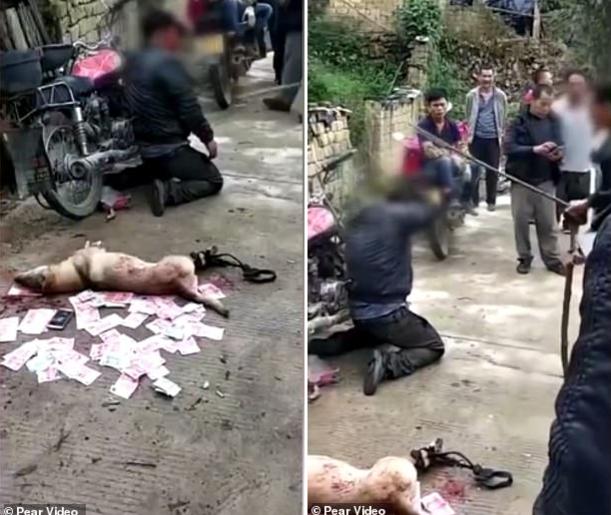 Cách vị trí tên cẩu tặc đang quỳ không xa là một con chó cả người đẫm máu, dường như đã chết cùng rất nhiều tờ tiền giấy rơi vãi bên cạnh.