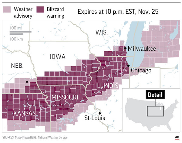 Cho đến trưa 25/11, tình trạng bão tuyết được cảnh báo lan rộng sang các khu vực phía đông bang Illinois, bao gồm thủ phủ Chicago. Theo dự báo, tuyết có thể rơi với mức độ gần 6 cm/giờ tại đây.