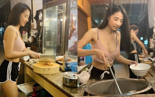 Không dừng lại ở kỹ năng thái thịt, riêng khoản ăn mặc của cô chủ cũng đủ lôi kéo khách hàng; cô thường diện những bộ cánh hở bạo, khoe trọn vóc dáng thanh tân quyến rũ cùng ba vòng chuẩn hệt như siêu mẫu, đủ để dân mạng gán cho biệt danh "nữ thần bán mỳ" cũng không ngoa.