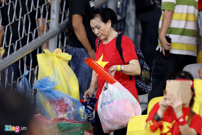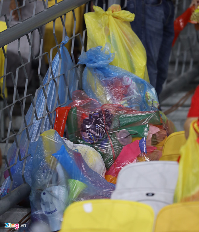 Sau trận đấu, số lượng vật dụng hỏng, rác thải khá lớn và CĐV Việt phải dùng tới nhiều túi chuyên dụng với kích thước lớn.