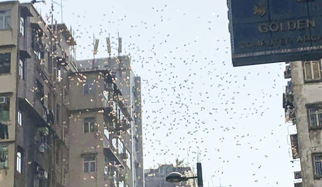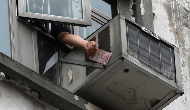 Tiền rơi xuống như mưa từ nóc ṭa nhà trên đường Phúc Hoa ở khu Cửu Long, Hong Kong hôm 15/12. Ảnh: Facebook.