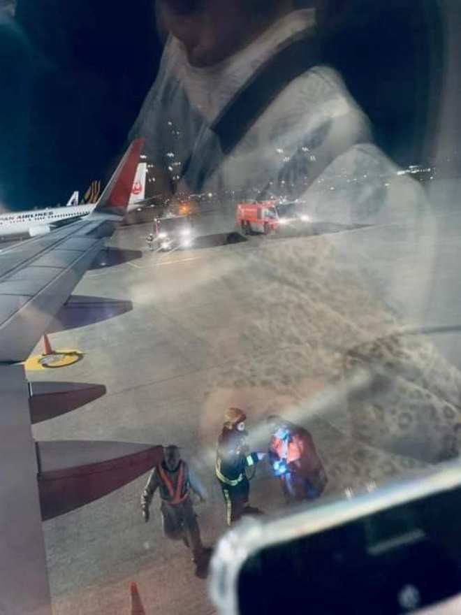 Xe cứu hỏa và lực lượng kỹ thuật sân bay được điều động kiểm tra sự cố. Ảnh do hành khách cung cấp.