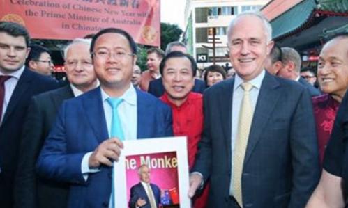 Hoàng Hướng Mặc (trái) chụp ảnh cùng cựu thủ tướng Malcolm Turnbull nhân dịp Tết Nguyên đán hồi tháng 2/2016 tại Australia. Ảnh: ABC.