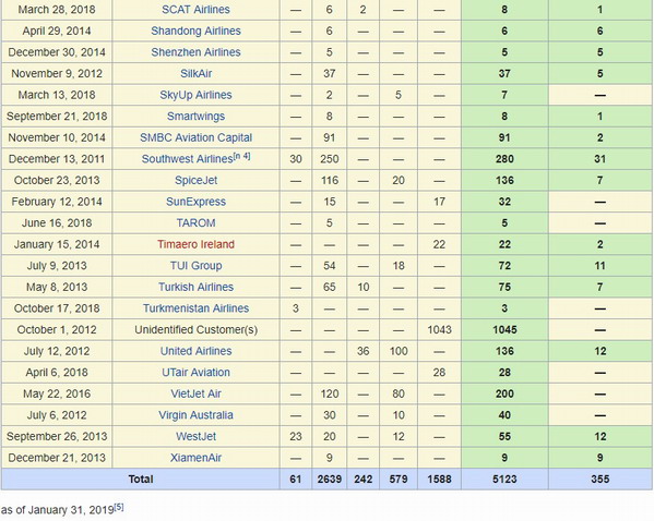 Có 355 máy bay đã được giao, tuy nhiên không có hãng máy bay nào dùng bay tới Việt Nam.