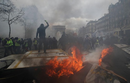 Người biểu t́nh "áo vàng" đốt phá tại Khải Hoàn Môn, Paris hôm 16/3. Ảnh: Reuters.