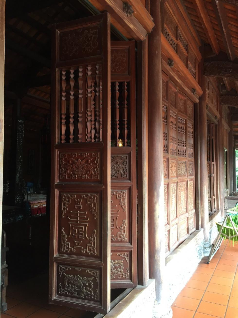 Cánh cửa, hoành đều trạm, đục hoa lá hay những Hán tự cổ. Ngay cả cái bậu cửa cũng được vuốt những đường rất kỳ công, phẳng lỳ. Theo ông Hạ, riêng tiền công đục chạm hết 650 triệu, chưa kể tiền sắm sửa nội thất trong nhà.