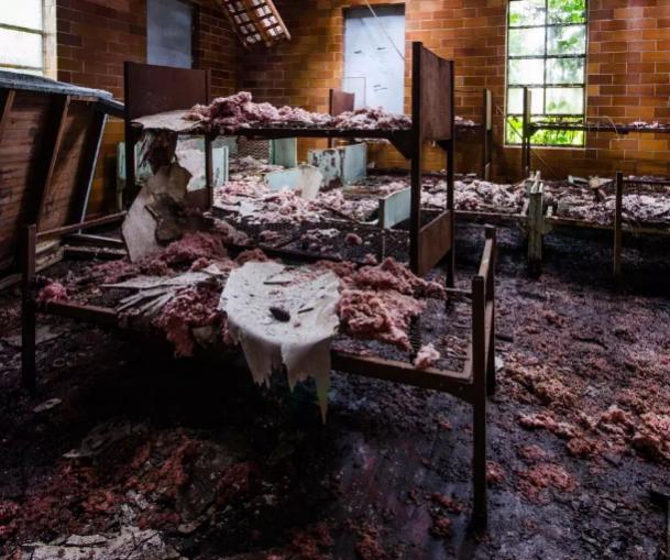 Khung cảnh đổ nát trong một kư túc xá của ngôi trường.