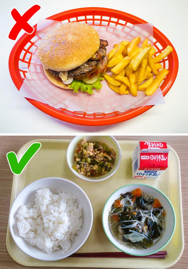 Bữa ăn của người Nhật thường không có món chính, đặc biệt ở các trường học, nơi học sinh hầu hết đều ăn tại căng-tin. Bữa ăn được chia thành nhiều món, mỗi món một ít với lượng thức ăn vừa phải, thường là cơm, súp miso, cá hoặc thịt.