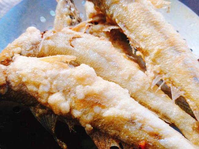 Đổ dầu vào chảo sâu lòng, đun sôi dầu. Sau đó thả cá vào chiên nhỏ lửa.