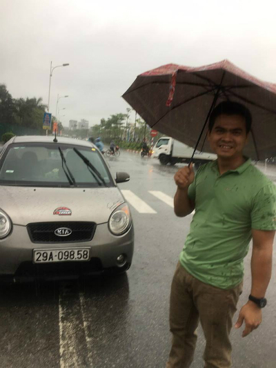 Bỗng thấy chiếc xe Kia từ từ dừng, tưởng lái xe ngồi trong ngó xem tôi thay lốp học kinh nghiệm, nhưng không phải, tôi nhầm. Người này mở cửa xe, cầm ô bước ra lấy che cho tôi thay lốp khỏi ướt. Tôi thấy thật cảm động trước hành động đầy nhân văn tình người của tài xế kia.