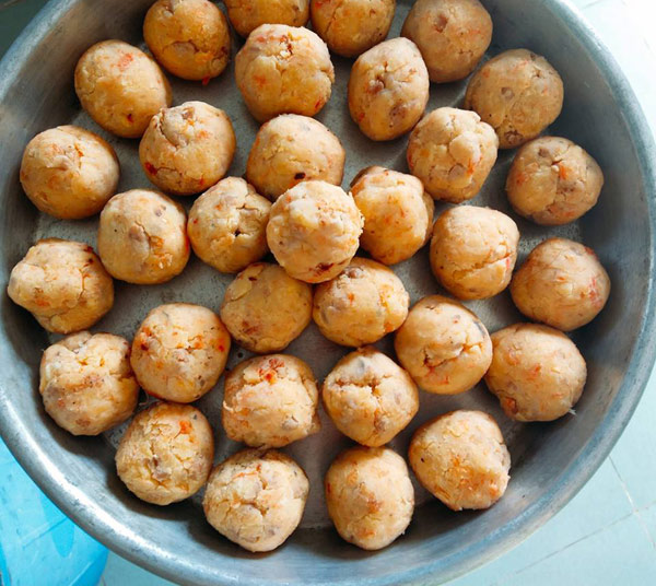 Đợi hỗn hợp vừa xào trên hơi nguội thì dùng tay vo lại những viên tròn vừa ăn, cho bột nếp và bột gạo vào thau trộn đều.