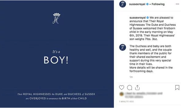 Không chỉ vậy, con đầu lòng của vợ chồng Hoàng tử Harry - Meghan còn là em bé hoàng gia đầu tiên khi chào đời được thông báo trên mạng xã hội Instagram, điều chưa từng có tiền lệ ở gia đình hoàng gia.