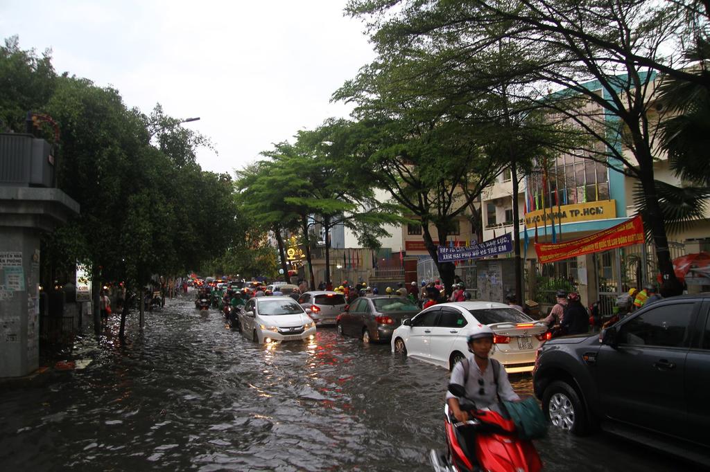 Ở nhiều nhiều khu vực, mưa khá nặng hạt và gây ngập cục bộ ở nhiều đoạn. Trên đường Nguyễn Hữu Cảnh, đoạn dưới chân cầu vượt (quận Bình Thạnh), mưa lớn khiến nước ngập hơn nửa bánh xe, nhiều xe máy đi qua bị chết máy khiến người dân phải dắt bộ.