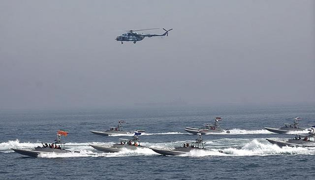 Eo biển Hormuz dù là tuyến đường thủy quốc tế, nhưng nó đi qua lãnh thổ Iran. Vệ binh Cách mạng Iran, lực lượng bán quân sự dưới sự chỉ huy của lãnh tụ tối cao Ayatollah Ali Khamenei, thường triển khai một đội xuồng tốc độ cao đi theo và cắt qua trước mặt tàu sân bay.