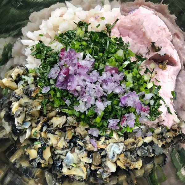 - Cho tất cả các nguyên liệu vào một cái tô lớn: ốc, giò sống, mỡ thái hạt lựu, mộc nhĩ, lá lốt thái nhỏ, hành lá thái nhỏ, hành khô băm nhỏ, gừng băm.