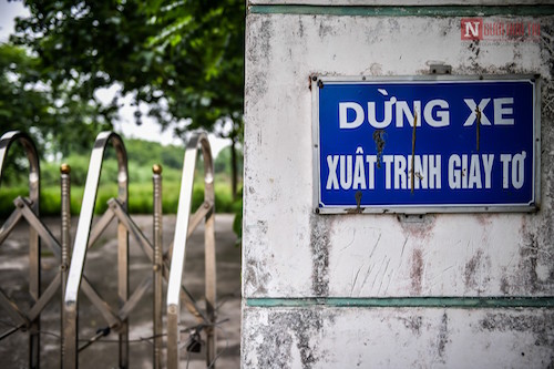 Đường vào bệnh viện, cây cối, cỏ mọc um tùm, barie gỉ sét.
