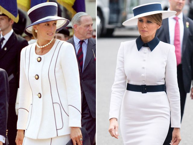 Trong sự kiện tháp tùng chồng tới lễ kỷ niệm Normandy ngày 5/6, bà Melania lựa chọn gam màu trung tính, nhã nhặn với chiếc mũ đội đầu gợi nhớ tới phong cách thanh lịch của Hoàng gia Anh. Chiếc mũ của nhà mốt Philip Treacy, hãng chuyên thiết kế mũ cho các nhân vật Hoàng gia Anh như Nữ Công tước xứ Cambridge, Nữ Công tước xứ Sussex và Công chúa Beatrice.