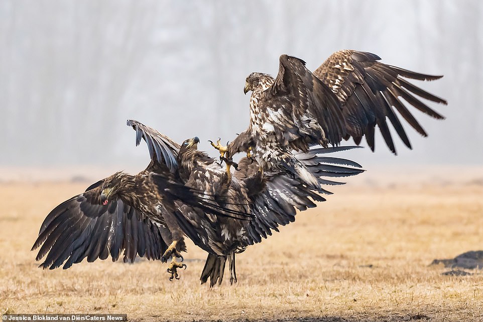 Những bức ảnh cho thấy một trận chiến không khoan nhượng giữa hai con đại bàng khổng lồ diễn ra tại bãi đất hoang ở Ba Lan. Hai con chim săn mồi lao vào cấu xé nhau khi bay là là mặt đất. Xung quanh chúng, những con đại bàng khác thận trọng theo dõi cuộc chiến.