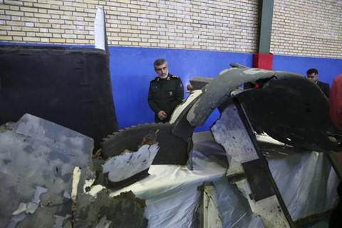 Người đứng đầu nhánh hàng không vũ trụ của lực lượng Vệ binh Cách mạng Iran, ông Amirali Hajizadeh bên cạnh những mảnh vỡ được cho là của chiếc máy bay không người lái RQ-4 Global Hawk của Mỹ bị bắn hạ. Ảnh: AP.