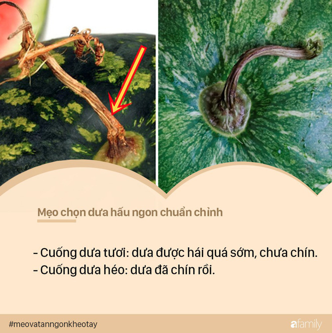 Nhìn vào cuống dưa sẽ tiết lộ cho bạn biết độ chín của trái dưa. Cuống dưa tươi, có màu xanh cho thấy dưa có thể được hái sớm và chưa chín. Cuống dưa héo cho thấy trái dưa này đã chín, ngon ngọt.
