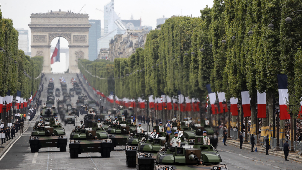 Lễ duyệt binh kỷ niệm quốc khánh Pháp sáng 14/7 được tổ chức theo nghi thức truyền thống trên Đại lộ Champs-Elysees tại Paris với sự tham gia của hơn 4.300 binh sĩ, 196 phương tiện cơ giới, 237 ngựa, 69 máy bay và 39 trực thăng, khiến buổi lễ hoành tráng tại thủ đô Paris nhân kỷ niệm 230 năm ngày quốc khánh Pháp gửi đi thông điệp về khả năng hợp tác quân sự ở châu Âu giữa bối cảnh rạn nứt quan hệ Âu - Mỹ.