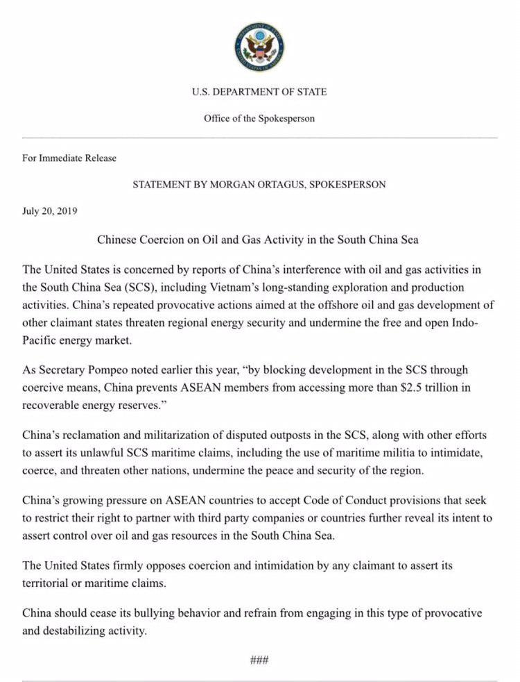 “Hoa Kỳ lo ngại bởi các báo cáo về sự can thiệp của Trung Quốc vào các hoạt động dầu khí ở Biển Đông, gồm các hoạt động thăm ḍ và khai thác lâu dài của Việt Nam. Trung Quốc lặp đi lặp lại các hành động khiêu khích nhằm vào sự khai thác dầu khí ngoài khơi của các quốc gia đ̣i chủ quyền khác, đe dọa an ninh năng lượng trong khu vực và làm suy yếu thị trường năng lượng tự do và rộng mở trong khu vực Ấn Độ – Thái B́nh Dương.... Hoa Kỳ kiên quyết phản đối sự ép buộc và đe dọa bởi bất kỳ nước đ̣i chủ quyền nào trên Biển Đông, nhằm khẳng định các yêu sách lănh thổ hoặc hàng hải của ḿnh. Trung Quốc nên chấm dứt hành vi bắt nạt và kiềm chế trong việc tham gia vào loại hoạt động khiêu khích và gây bất ổn này.