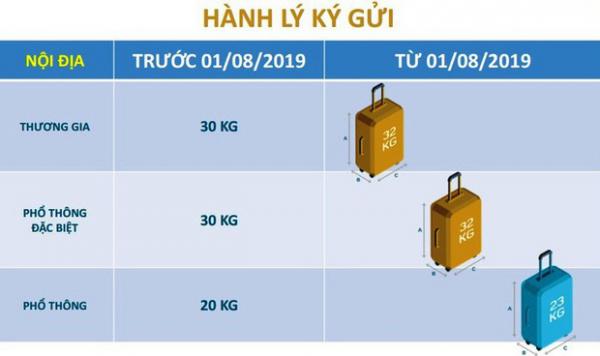 Mới đây, Hăng hàng không Quốc gia Việt Nam Vietnam Airlines vừa ra thông báo sẽ chính thức thay đổi chính sách hành lư kể từ 1/8/2019. Với hành lư x_á_ch tay th́ sẽ tăng mỗi hạng lên 5kg c̣n hành lư kư gửi sẽ tăng lên 23kg đối với hạng phổ thông và 32 kg đối với hạng thương gia.