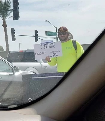 Một người đàn ông Mỹ nhận được kết quả bất ngờ khi in ra 200 bản lý lịch rồi phát cho những người qua lại ở một góc phố giữa cái nắng 43 độ C, khiến đã nhận được hàng trăm tin nhắn từ các công ty, nhà thầu, nhà tuyển dụng và thậm chí những người lạ chỉ chúc anh may mắn nhờ đứng tìm việc bên đường .