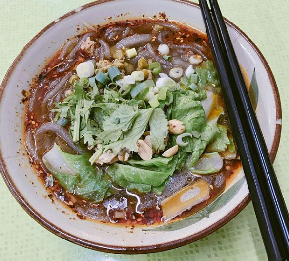 Đây là một trong những món ăn nổi tiếng nhất đến từ tỉnh Vân Nam. Đằng sau tên của món ăn là một câu chuyện ngọt ngào về tình nghĩa vợ chồng. Mì qua cầu gồm các nguyên liệu chính là nước dùng gà bổ dưỡng, mì gạo, thịt và rau xắt nhỏ cùng nhiều loại gia vị đặc biệt. Mì qua cầu là một trong những món ăn được ưa thích nhất của Vân Nam, và thực khách có thể được tìm thấy món ăn này ở khắp mọi nơi từ các nhà hàng cao cấp đến các quán ăn ven đường.