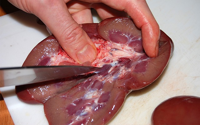 Trước tiên hãy lột bỏ lớp màng mỏng phủ bên ngoài của quả cật heo rồi dùng dao xẻ làm đôi quả cật. Lọc bỏ toàn bộ phần màng trắng bên trong quả cật (đây chính là tuyến hôi khiến món ăn trở nên khó chịu nếu bạn không làm sạch), rửa vài lần với nước lạnh. Sau đó cho quả cật vào bóp với giấm chua để có thể loại bỏ mùi hôi.