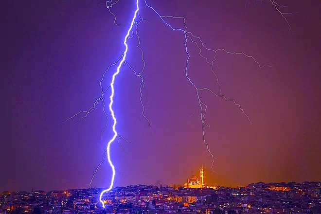 Tia sét đánh vào Nhà thờ Hồi giáo Fatih trên bầu trời Istanbul, Thổ Nhĩ Kỳ, trong cơn giông bão ngày 7/5/2017.