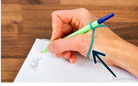Để giúp trẻ cầm bút đúng cách, bạn có thể dùng dây chun mềm, cuốn như hình vẽ và tư thế cầm bút sẽ được uốn nắn hợp lý
